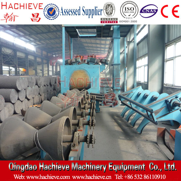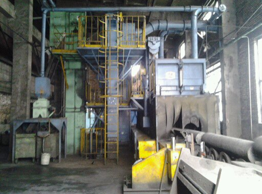 該拋丸機(jī)是清理炭素電極的,碳素電極經(jīng)過上料系統(tǒng)將工件送到送進(jìn)輥道上,送進(jìn)輥道將碳極送進(jìn)清理室,利用高效拋丸器將彈丸高速拋射到被清理工件表面上,對(duì)工件進(jìn)行沖擊刮削,以清除工件表面的冶金焦粒,拋丸清理后,工件通過高壓風(fēng)機(jī)進(jìn)行吹灰,比較后工件經(jīng)送出輥道送到卸料系統(tǒng),由卸料小車帶動(dòng)工件送到水平導(dǎo)軌上運(yùn)走。